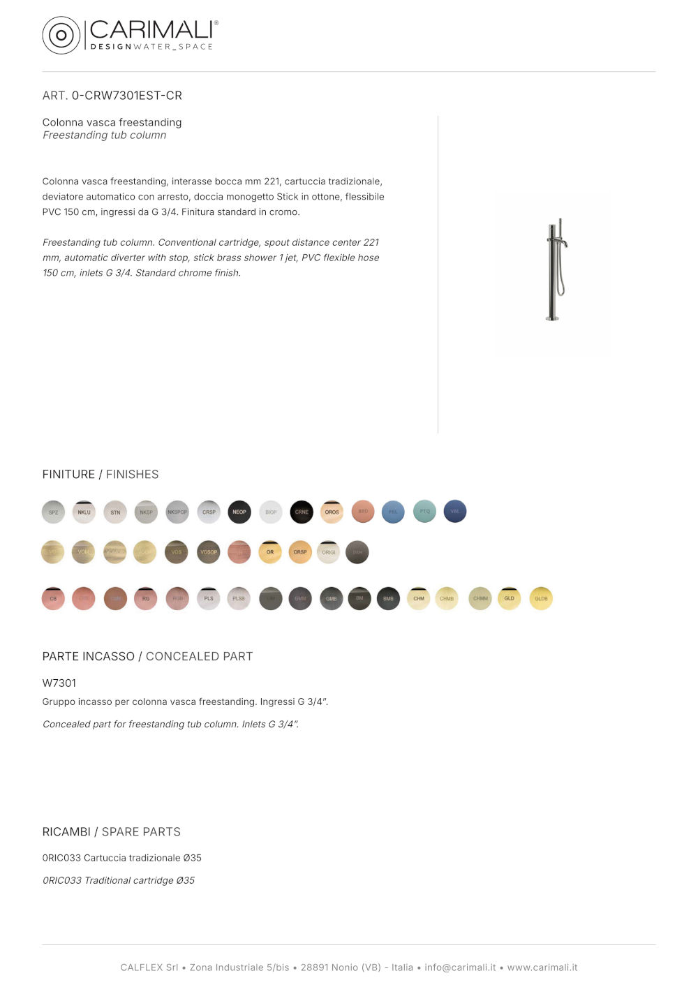 Die freistehende Duschsäule ist mit einem Auslauf mit 221 mm Achsabstand ausgestattet; sie enthält außerdem eine traditionelle Kartusche, einen automatischen Umsteller mit Absperrung, eine Stick-Handbrause aus Messing mit einem Strahl, einen 150 cm langen PVC-Schlauch und G 3/4-Anschlüsse.