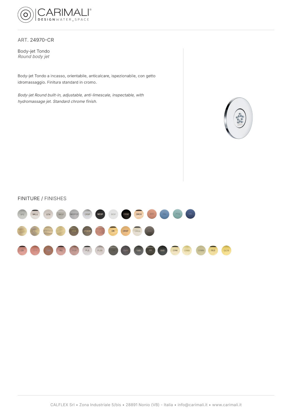 Carimali’s Scull Carimali recessed, swiveling, anti-limescale body-jet with nozzles designed for an effective whirlpool jet; in addition, the inspectable structure simplifies maintenance.