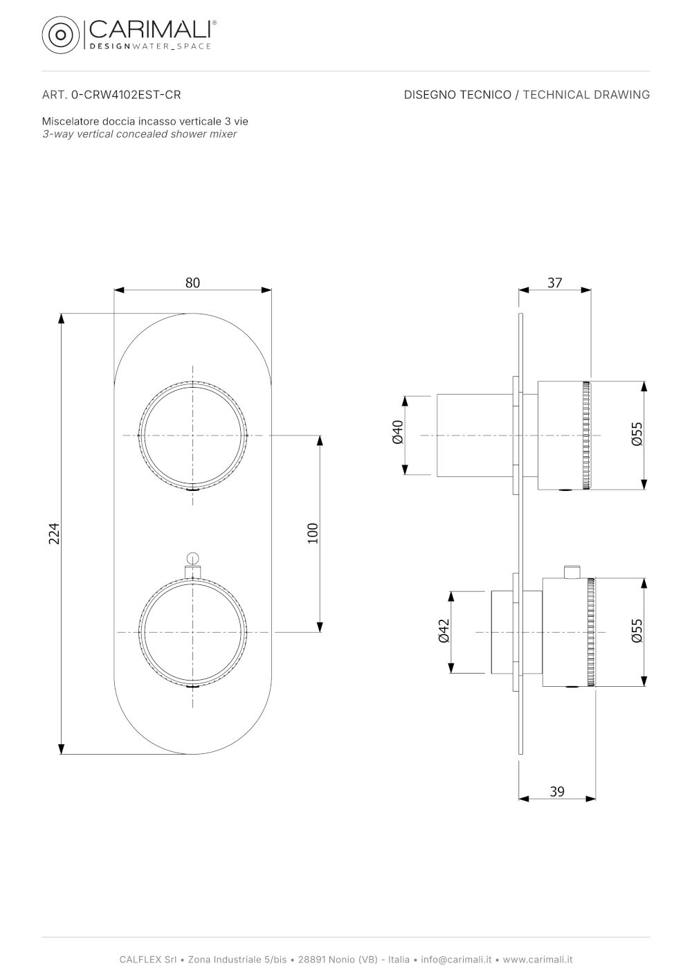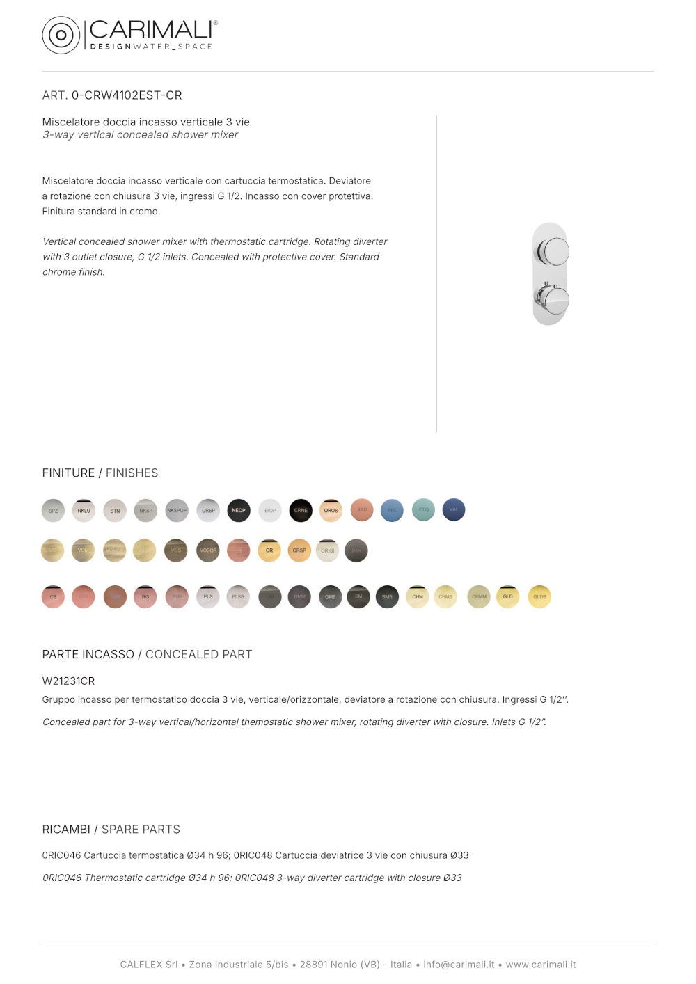 Il miscelatore incasso doccia termostatico 3 vie Crown Carimali è dotato di deviatore a rotazione con chiusura 3 vie, ingressi G 1/2. Incasso con cover protettiva. Possibilità di installazione sia in orizzontale che in verticale.