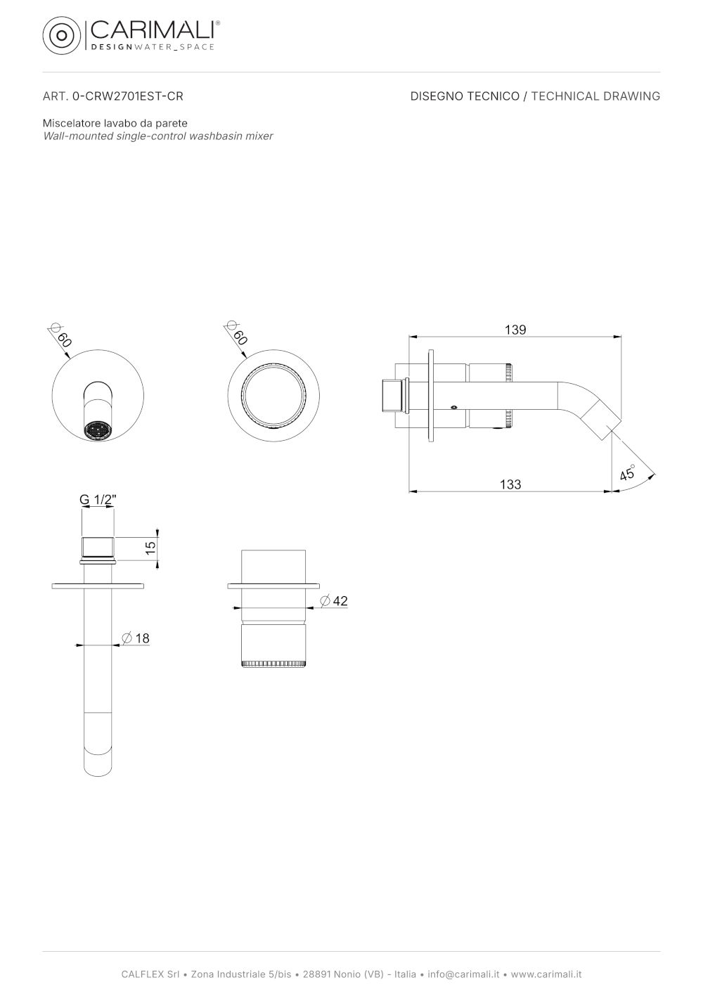 Il miscelatore lavabo a parete Crown Carimali offre un’interasse bocca da 120 mm; inoltre, include una cartuccia tradizionale e ingressi G 1/2. È completato da comando remoto a parete con rosone e fornito senza scarico.